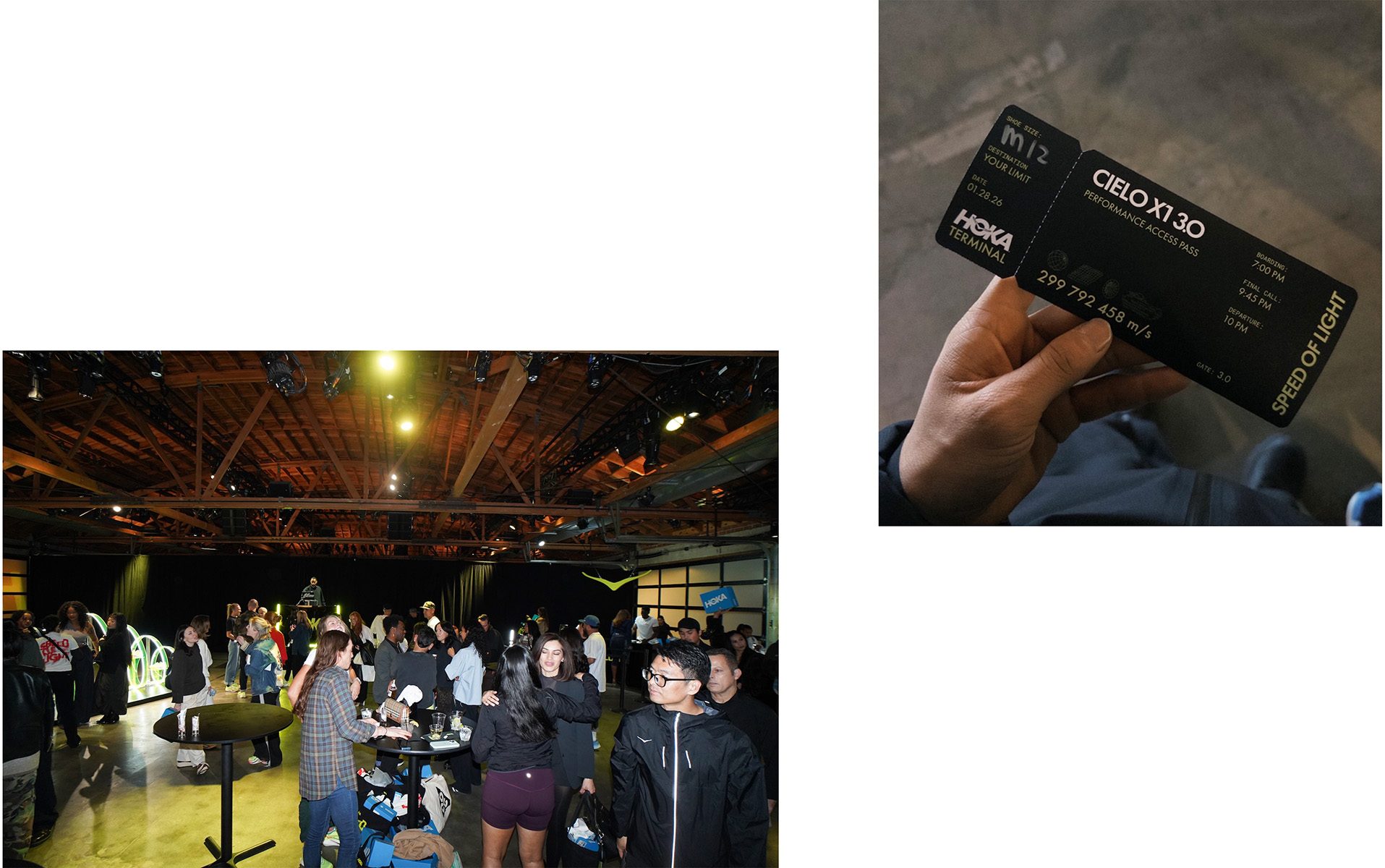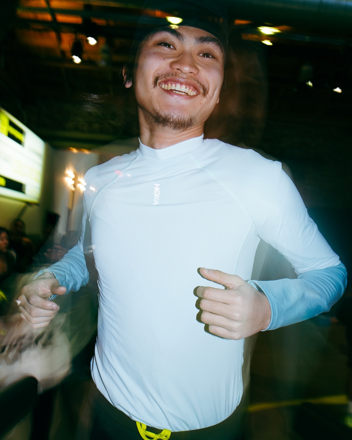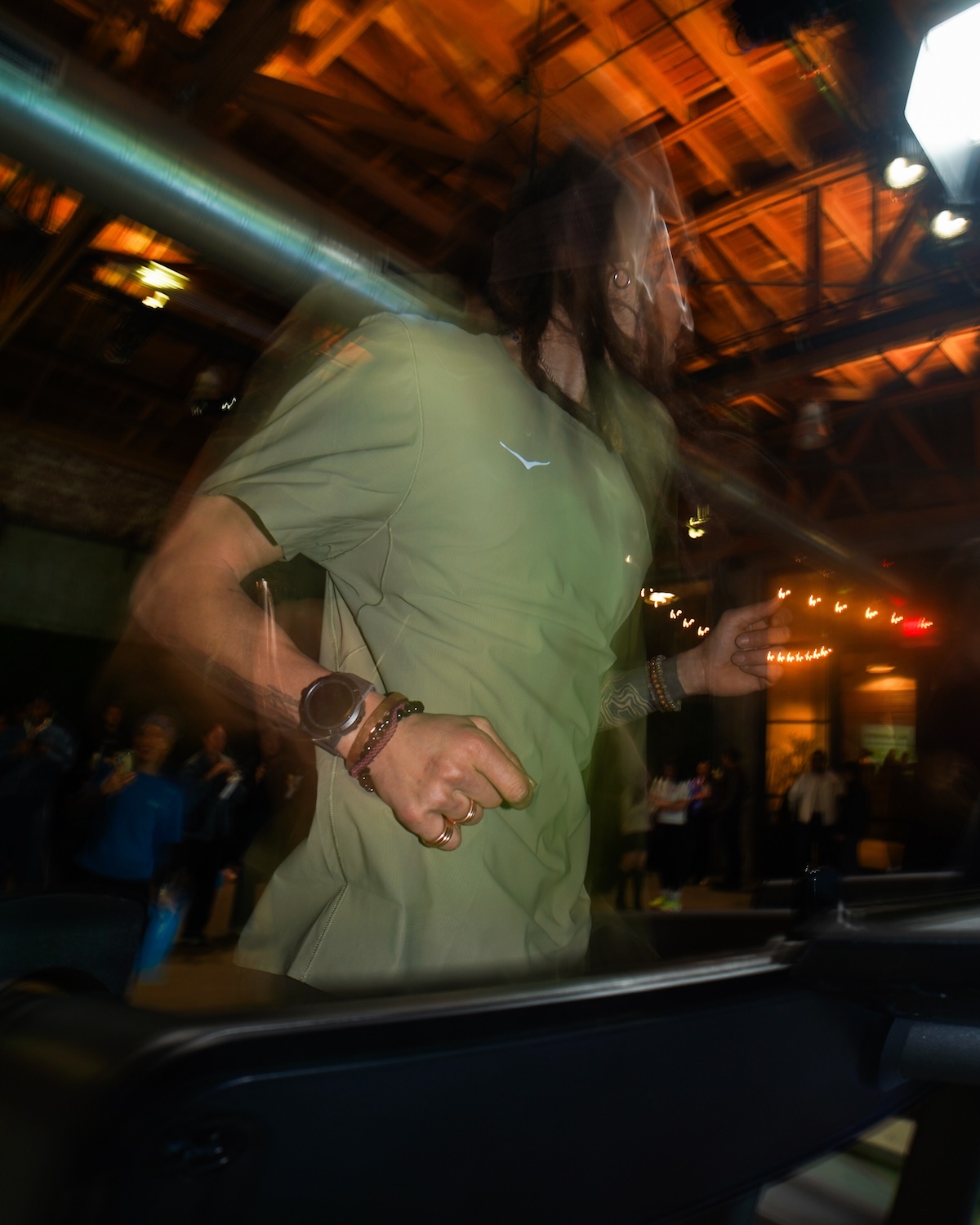 最近、ブランドキャンペーンアンセムとして「TOGETHER,WE FLY HIGHER」=「ひとりでは届かない高みへ」をコンセプトに掲げた〈HOKA〉。本イベントでは、航空券を模したインビテーションでチェックインし、会場に入る。場内にはトレッドミルが設置され、思い思いに《Cielo X1 3.0》の最新テクノロジーによるランを味わえる。音楽が流れ、没入感のあるラン体験は、まさに、飛行機が離陸して飛行するイメージだ。アメリカならではの大規模な会場で、クラブみたいなムードのフロアも。そんな中でも嬉しいハプニングがチラホラ。