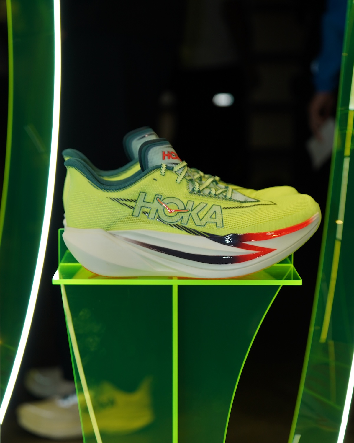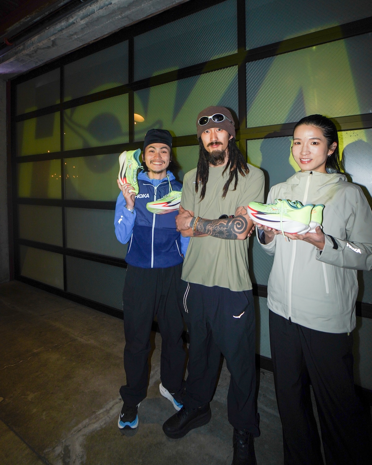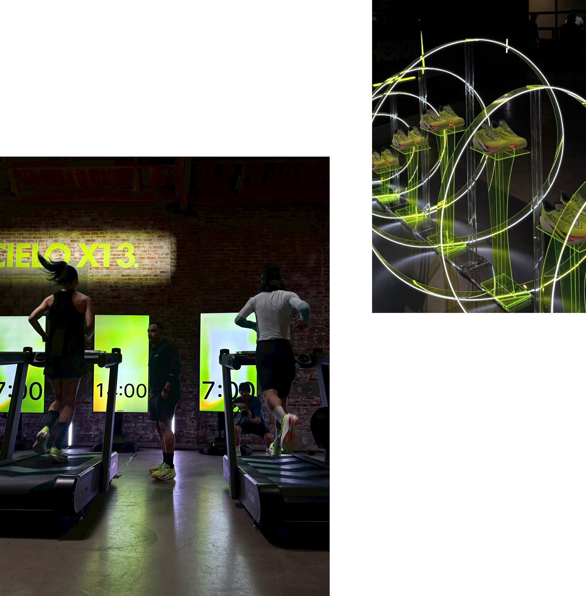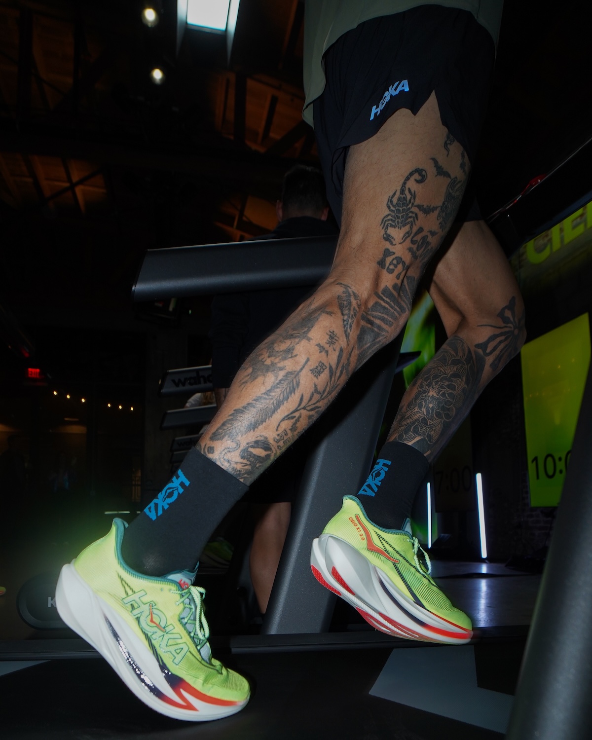 最近、ブランドキャンペーンアンセムとして「TOGETHER,WE FLY HIGHER」=「ひとりでは届かない高みへ」をコンセプトに掲げた〈HOKA〉。本イベントでは、航空券を模したインビテーションでチェックインし、会場に入る。場内にはトレッドミルが設置され、思い思いに《Cielo X1 3.0》の最新テクノロジーによるランを味わえる。音楽が流れ、没入感のあるラン体験は、まさに、飛行機が離陸して飛行するイメージだ。アメリカならではの大規模な会場で、クラブみたいなムードのフロアも。そんな中でも嬉しいハプニングがチラホラ。