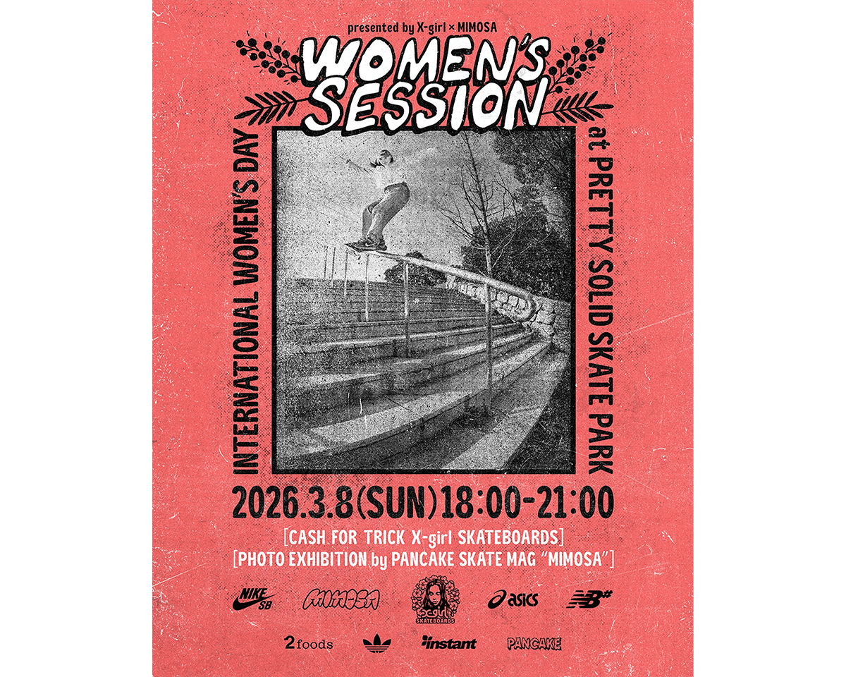 ストリートブランド〈X-girl〉発のスケートボードに特化したコンテンツ〈X-girl skateboards〉が、フリーマガジン『PANCAKE SKATEBOARD MAGAZINE』とタッグを組み、国際女性デーである3月8日(日)にイベント「WOMEN’S SESSION by X-girl × MIMOSA」を開催する。国際女性デーは、女性の社会的、経済的、文化的、政治的地位において「ジェンダー平等」を尊重していこうと制定された記念日。今回のイベントはこれにちなみ、スケートボードのシーンを「“女の子でもできる”ではなく、“女の子がそこにいることが当たり前”になる」ようにしたいというステイトメントのもと企画された。スケートボードの世界は、まだまだ男性中心の世界に見られることも少なくないのだそう。けれど〈X-girl〉が目指すのは、上手さや強さだけを価値とせず、誰かに制限もされず、スケートボードを自由に楽しく自己表現できるカルチャーにすることだ。当日は、女性スケーターを対象としたセッションや、『PANCAKE SKATEBOARD MAGAZINE』から発行された特別号“MIMOSA”の写真展示を行う予定。上映会や、DJ、フリードリンクなど楽しい催しもあるので、気軽に足を運びたい。開催は神奈川県〈Pretty Solid skate park〉にて。