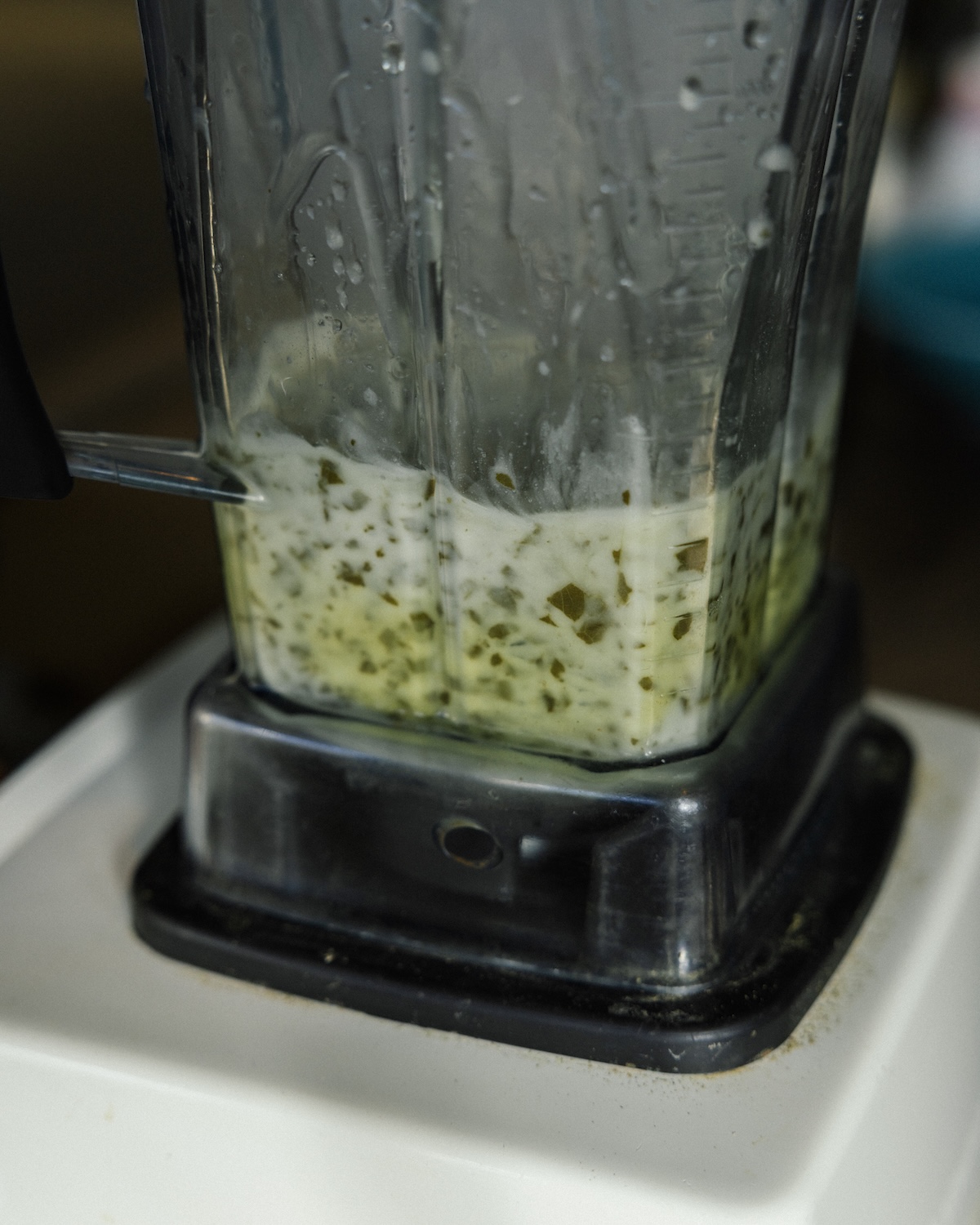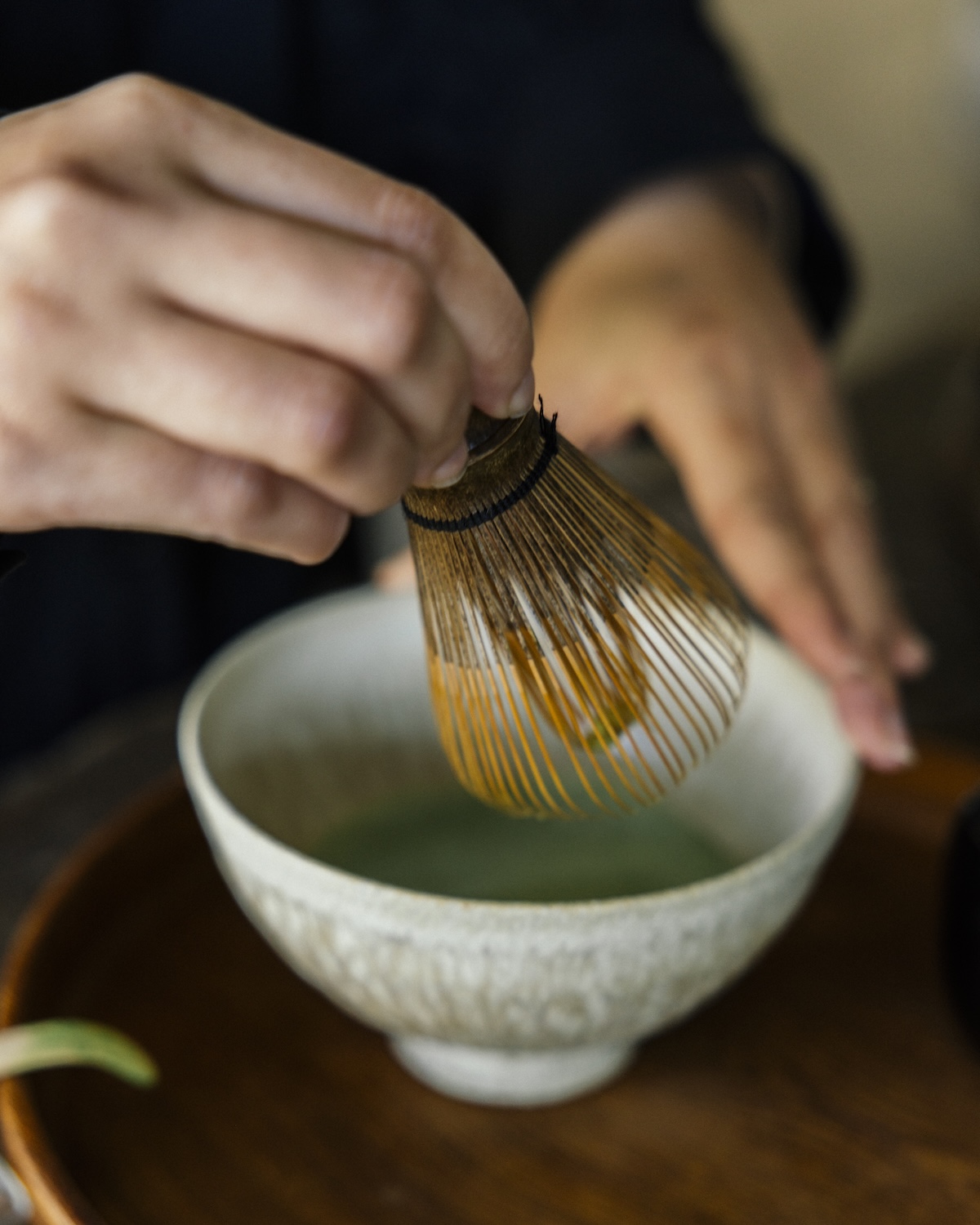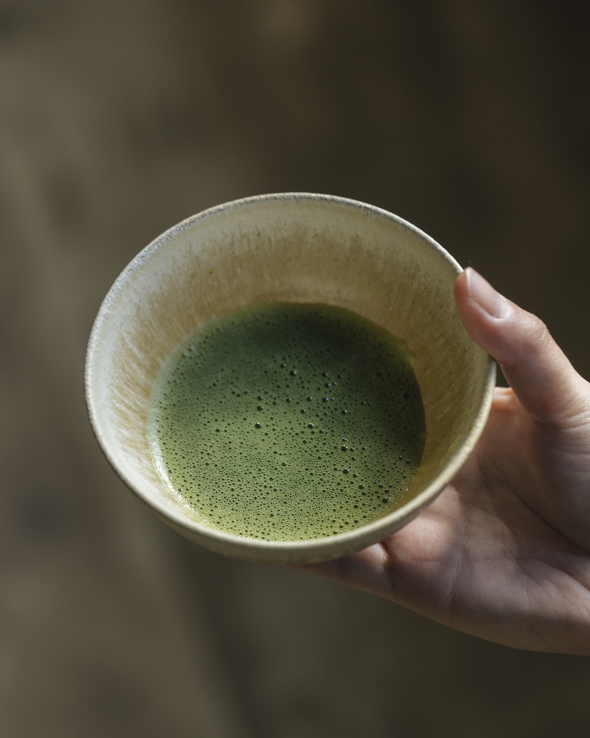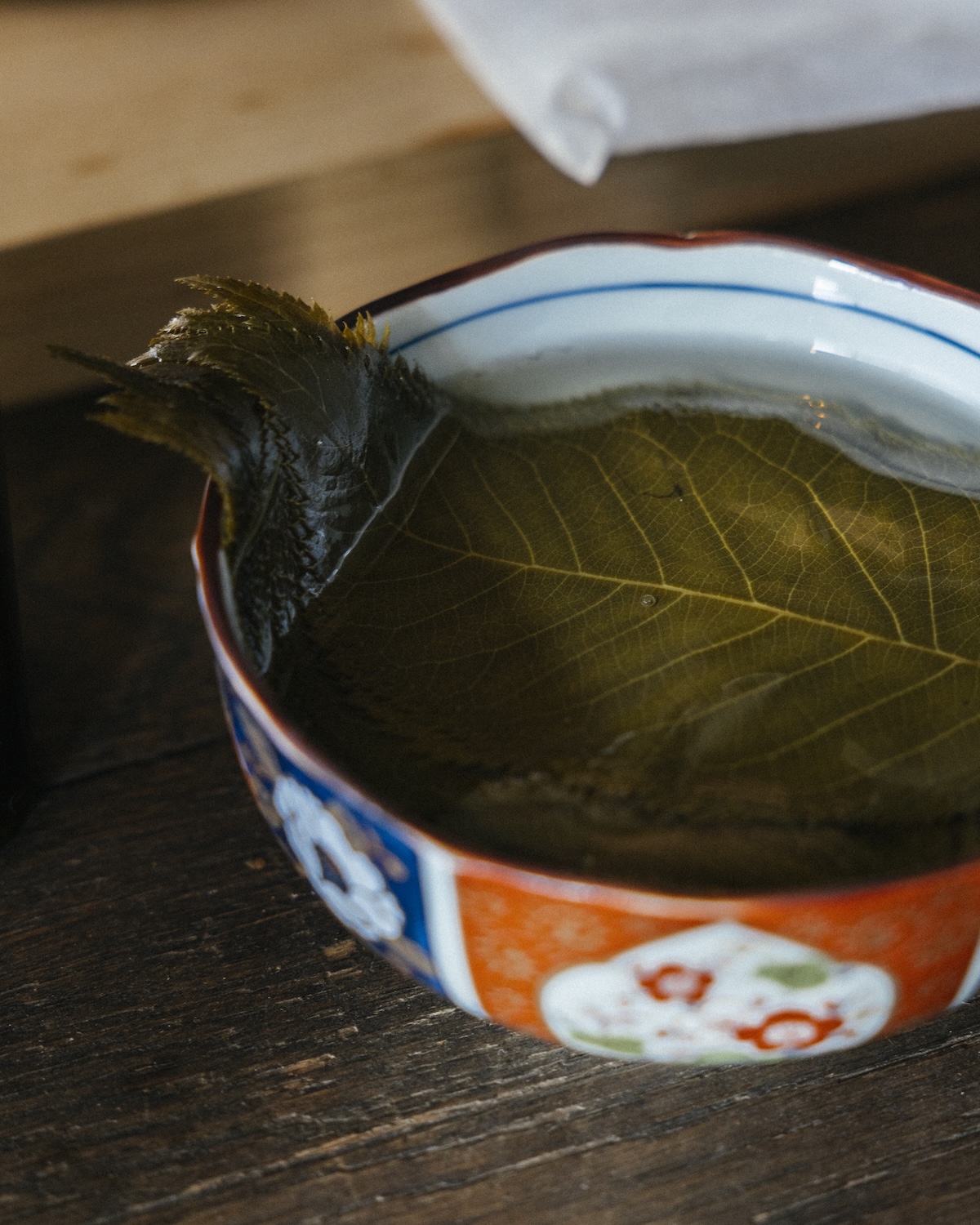 ローズマリーの水出し茶で抹茶を点てる方法からインスピレーションを受け、今回は桜の葉の香りを抽出したお湯で、抹茶を点てます。抹茶に限らずこの重ね茶的な手法ならば、それぞれ抽出方法が違う茶葉を合わせて楽しむことができます。いっぺんにお茶を淹れるよりも、それぞれ最適な方法、ジャストなタイミングを選ぶことができるのが、最大の利点です。大島桜はクマリンの含有量がとても多く、春らしいリッチな味わいになります。塩漬け桜葉に比べると、少し青さも残っているので、桜と同時によもぎのような風合いも感じられるかもしれません。