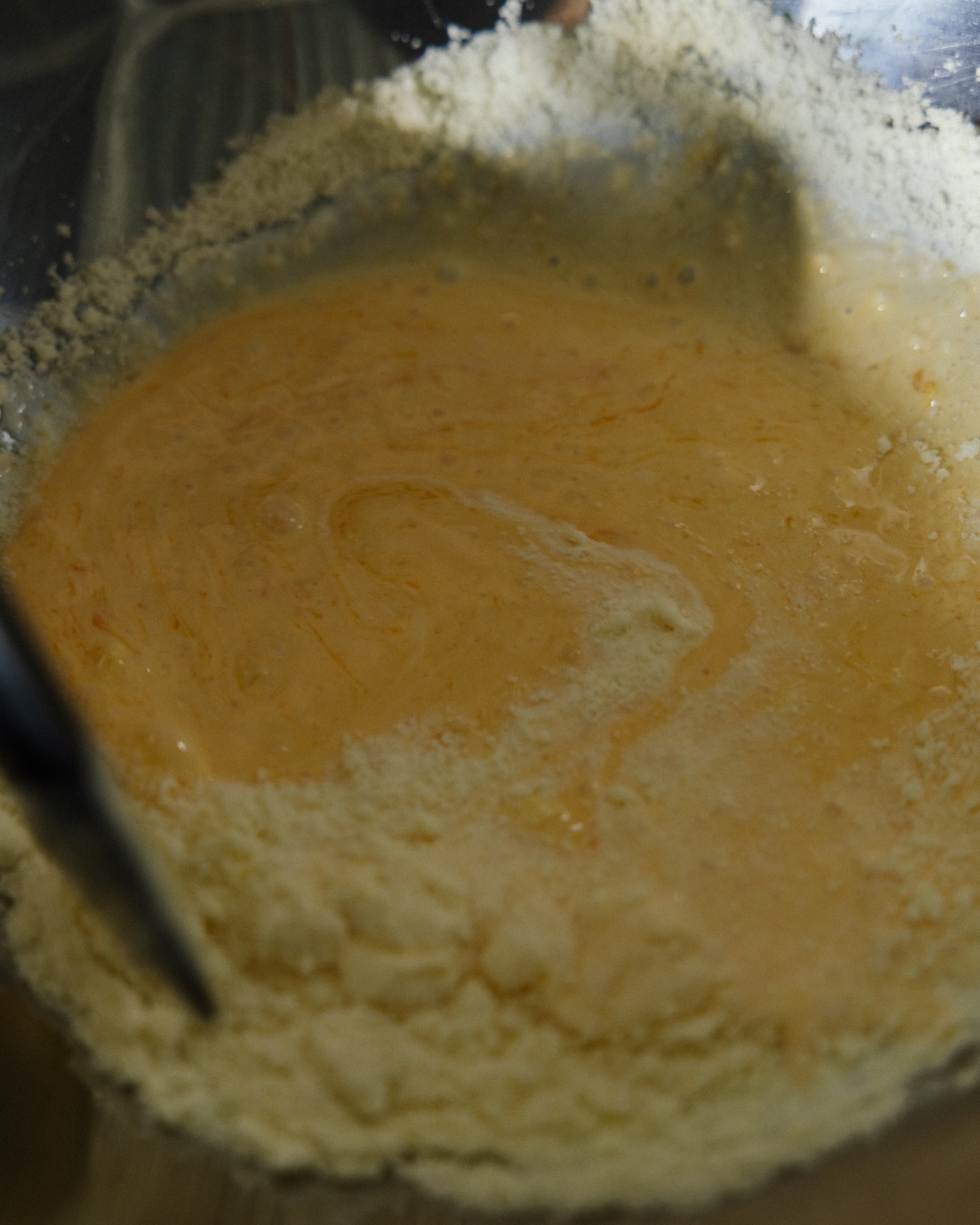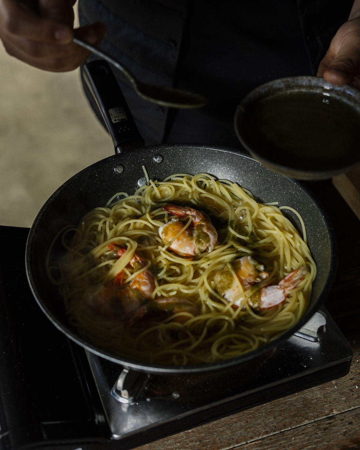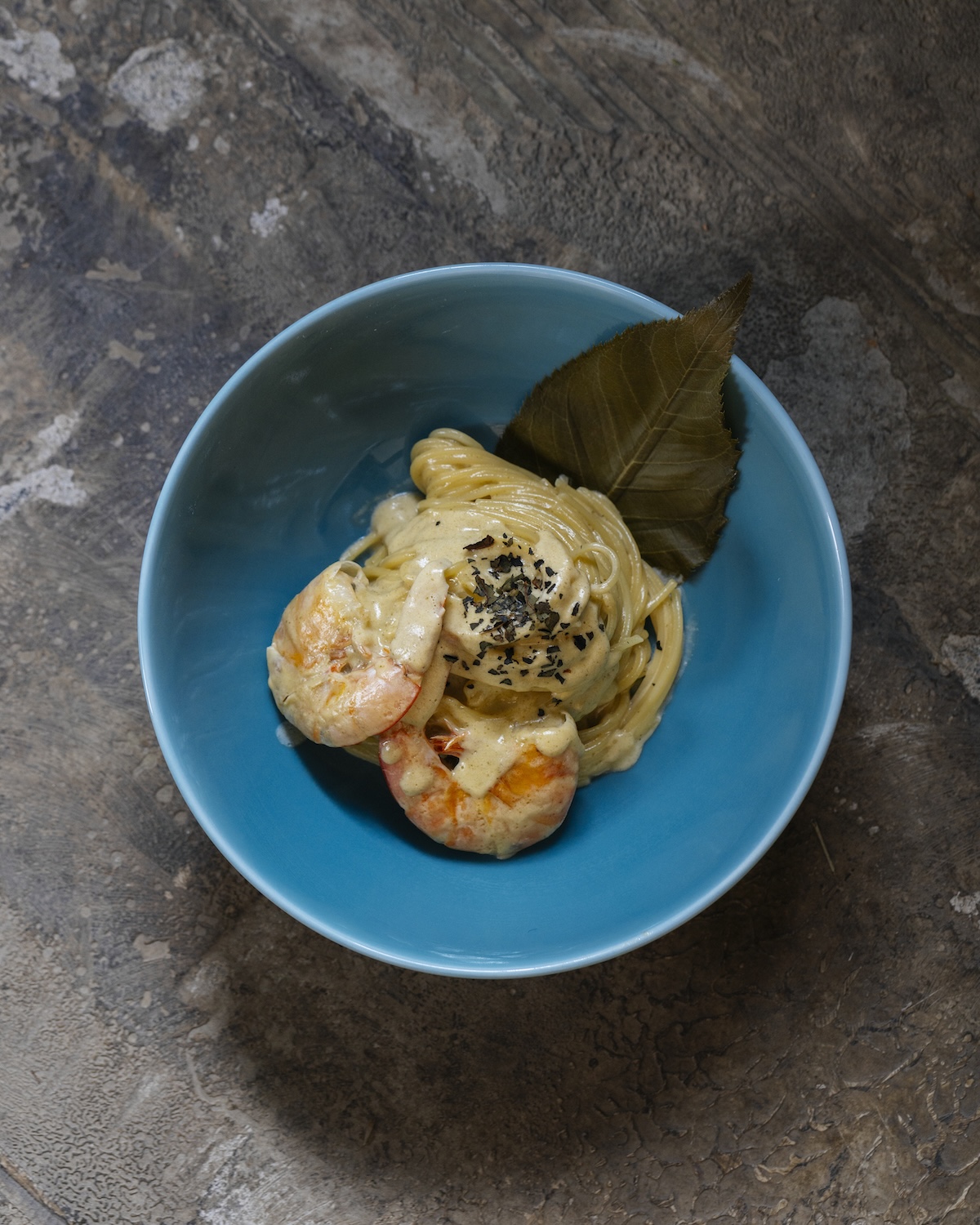 一般的にイメージする食材としての塩漬けの桜にも、やはり利点は多くあります。葉を一番いいタイミングで収穫して保存することができますし、塩漬けならではのうまみが出る。今回はそのうまみを生かすべく、豚の塩漬け・グアンチャーレの代わりに、桜の塩漬けを使ったカルボナーラを作ります。クマリンはバニラなどにも含まれる成分なので、クリーム系のものにも非常に合う。今回は色味を合わせて海老を使っていますが、入れなくても十分美味しい。卵黄は使っていますが、ベジタリアンの方でも食べられるカルボナーラです。