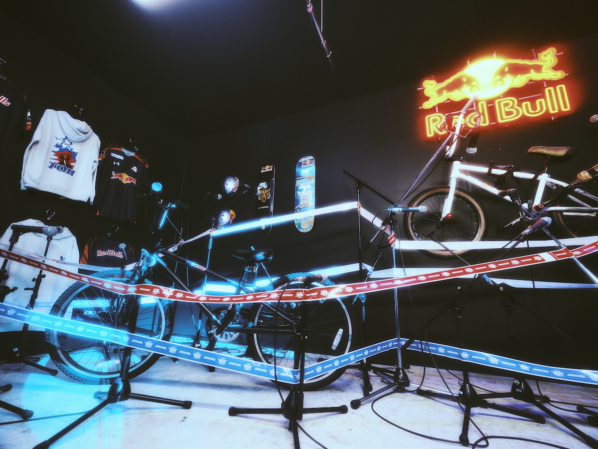今回、特にユニークなのが、メインパートナーである〈Redbull〉の所属アスリートたちが、愛用のギアを提供しているということ。草木ひなの、⼩野寺吟雲、早川起⽣など、憧れのプロアスリートたちのスケートボードやヘルメット、自転車までもがコンビニに並ぶ。